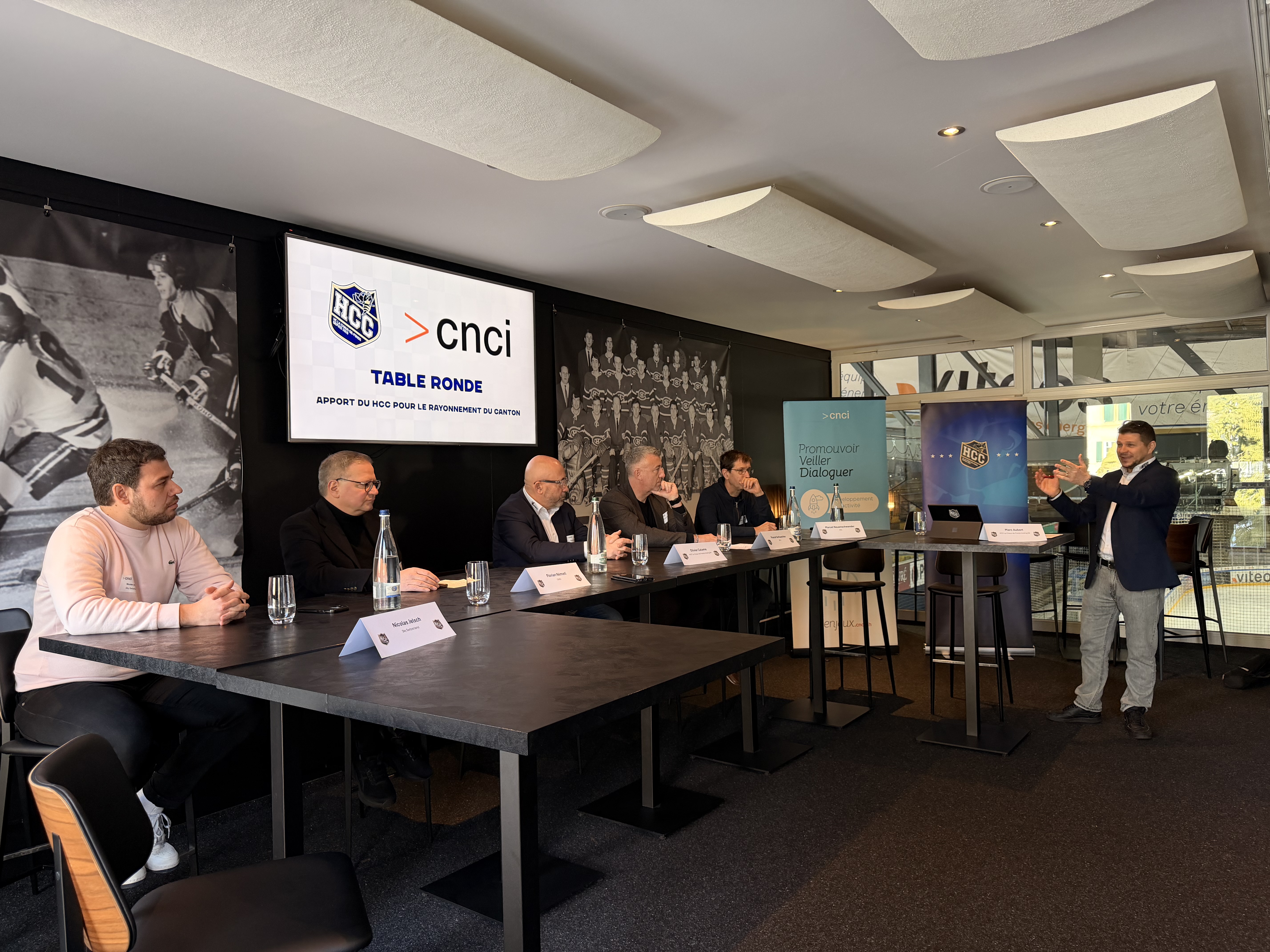 Le rôle d’un club sportif professionnel dépasse largement le cadre d'un stade, d'une salle ou d'une patinoire : son impact économique et social peut bénéficier à une région entière. Dès lors, "quel est l’apport d’une organisation comme le HCC pour le rayonnement de notre canton?". A cette question ont répondu cinq personnalités: Olivier Calame, Président du HC La Chaux-de-Fonds, Nicolas Jelsch, Directeur des sports de Sky Switzerland, Florian Németi, Directeur CNCI, Pascal Schluechter, Responsable Marketing et Sponsoring à la BCN, et chargé de cours « Marketing sportif » à l’Université de Neuchâtel, Marcel Neuenschwander, journaliste sportif chez RTN. L'événement, organisé dans le cadre du partenariat CNCI – HCC, a eu lieu à la Business Loge de la patinoire des Mélèzes le 16 janvier passé. Marc Aubert, Directeur commercial & marketing du HC La Chaux-de-Fonds (membre CNCI) a animé la table ronde au cours de laquelle les messages suivants ont été délivrés.